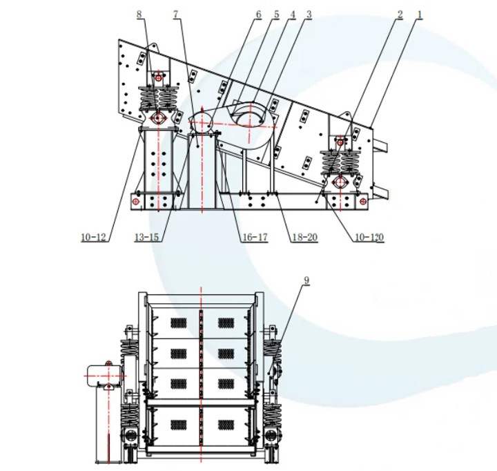 振動產生:振動器通過驅動裝置產生振動力,將篩機箱體進行振動。振動器通常安裝在篩機的上部或下部,產生垂直方向的振動力。